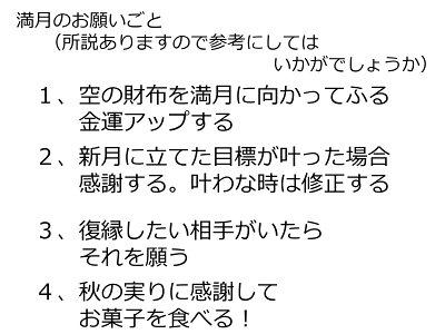 いろんな種類のお菓子の詰合わせでリピートが多い商品です お月見 うさぎ団子 中秋 十五夜 お月見 十五夜 満月にお願い事(所説ありますので、ご参考にされてみてはいかがでしょうか1、満月に向かって空の財布を振って金運アップする2、新月に立てた目標が叶った時は感謝する。
