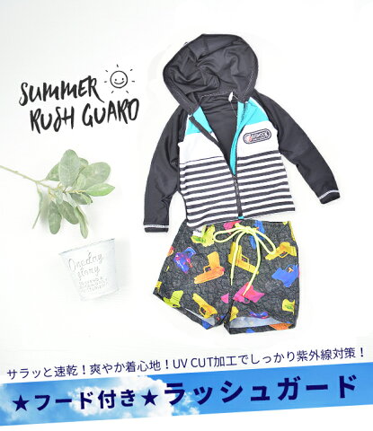 【送料無料】 フード付き ラッシュガード 水着 スイムウェア UV 紫外線 日焼け 夏 海 川 プール 水遊び 子供 ベビー キッズ 男の子 ボーイズ 90cm 95cm ホワイト/ブラック/ブルー/グリーン ボーダー 835445