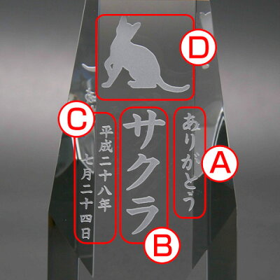 ■A…メッセージなどを彫刻します ■B…お名前などを彫刻します ■C…没年・行年などを彫刻します ■D…イラストを選べます [A・B・C]のフォント…【フォントNo.J-10】 ■A…8文字程度 ※日本語のみ ■B…5文字程度 ※日本語のみ ■C…14文字程度 ※日本語のみ 文字は縦書きとなりますので日付などの数字を彫刻する場合は漢数字・英数字に注意してご入力ください。